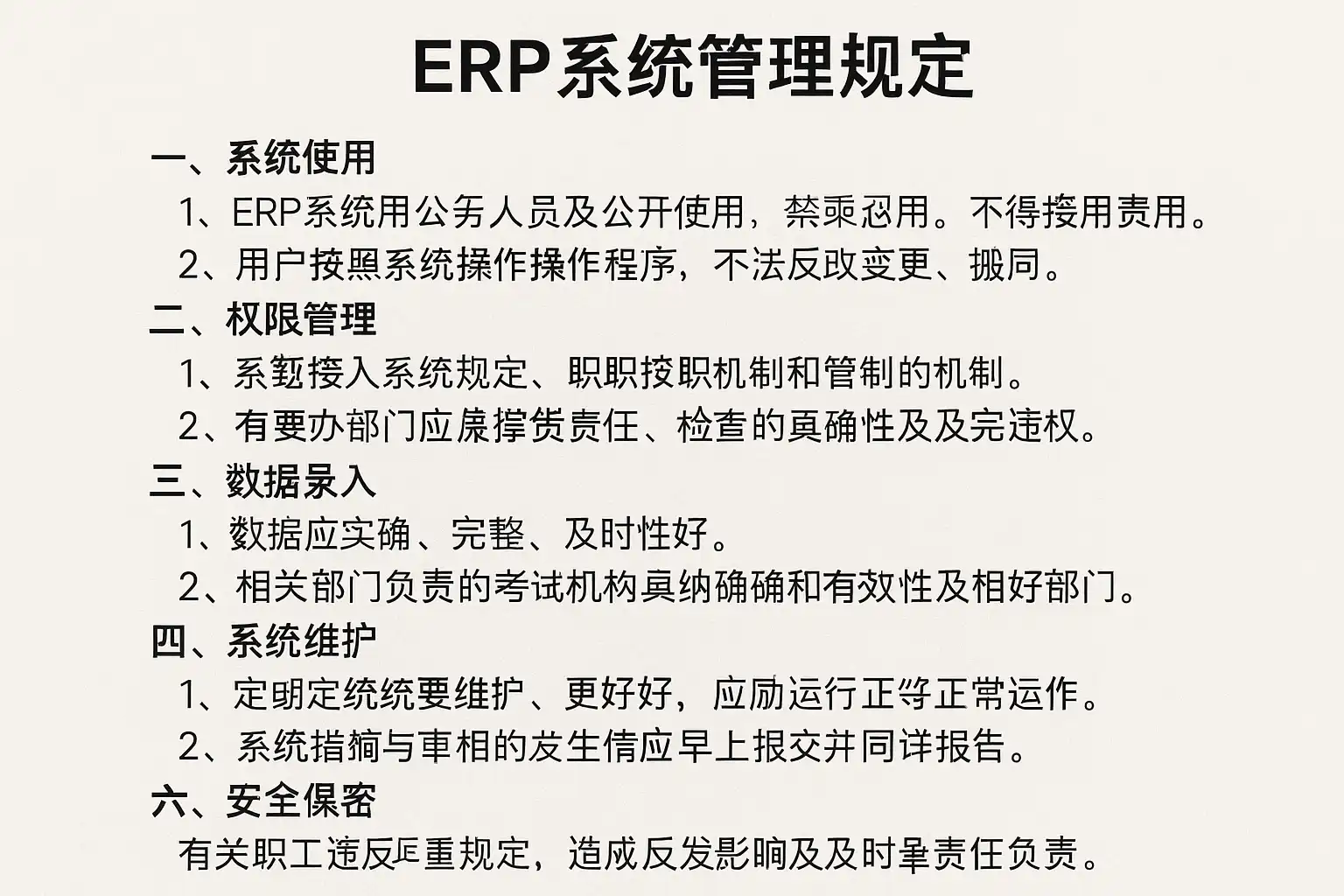 高质量的数据是ERP价值发挥的基础。不严谨的数据录入会导致决策失误甚至公司损失。因此,管理规定需明确: