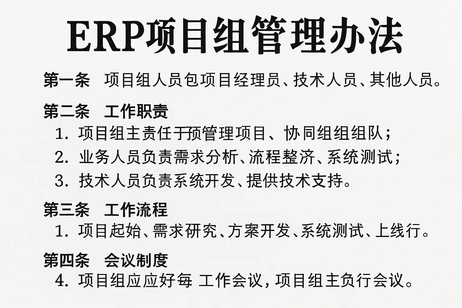 ERP项目组管理办法的核心目标是通过规范化流程和明确职责,提升ERP实施效率与质量。具体包括: