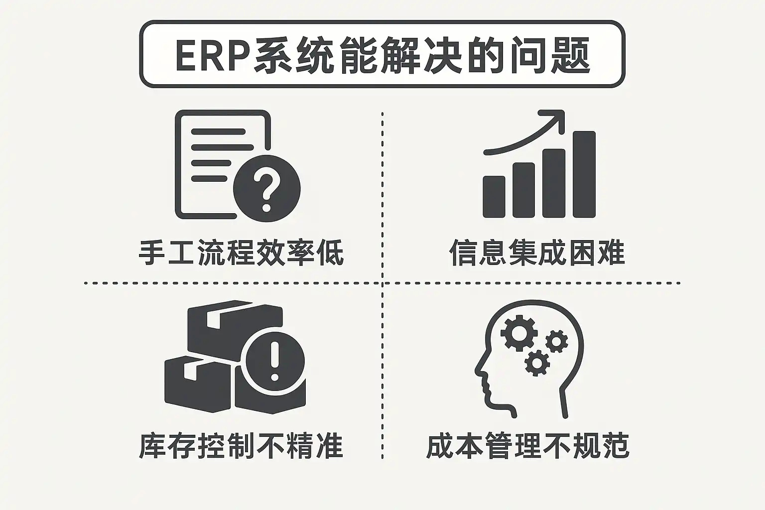 | 4 | 财务与业务脱节 | 财务业务一体化,实现精细化成本控制和利润分析 |