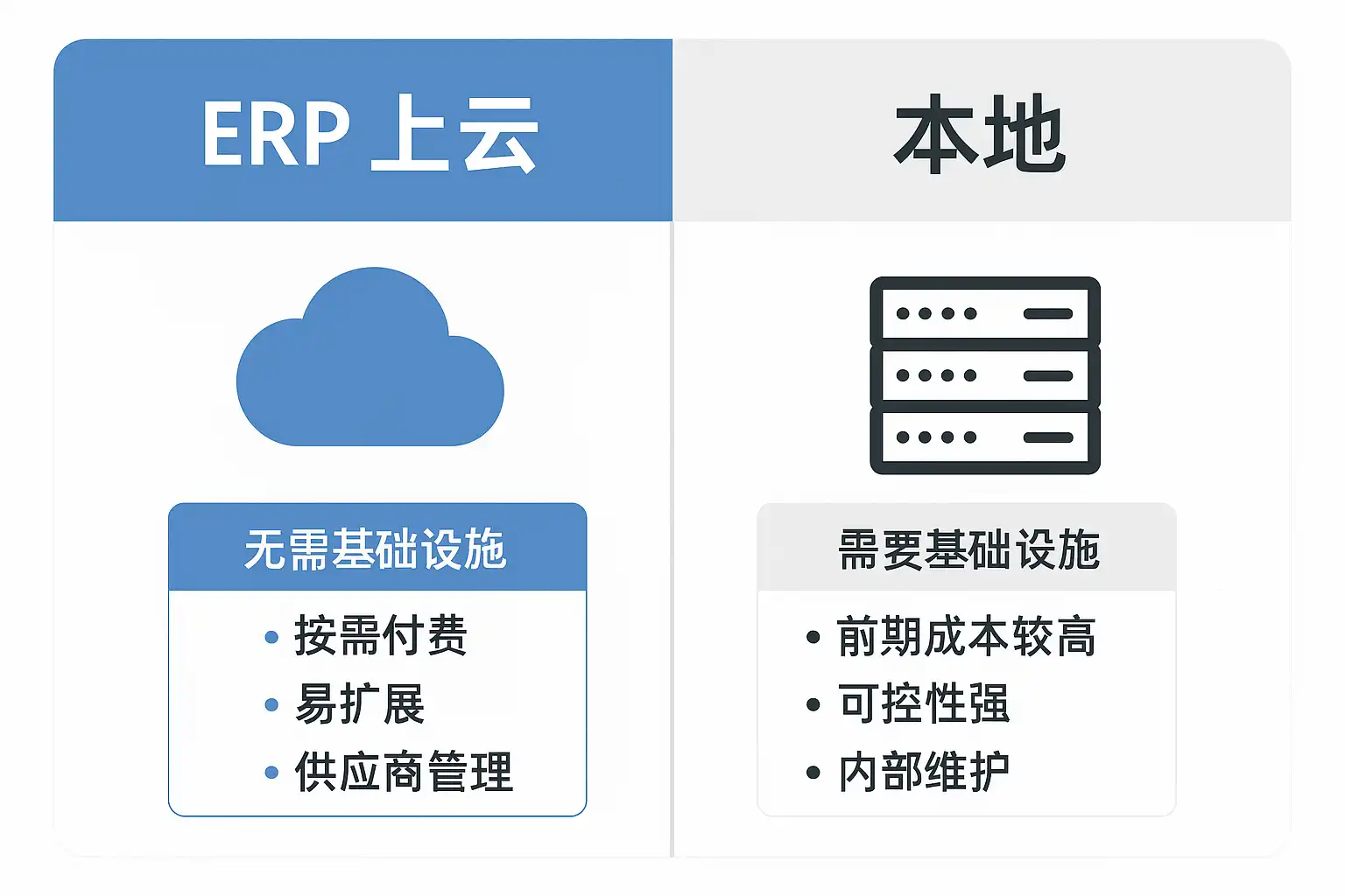 | 维度 | 本地部署ERP | 上云(SaaS/私有云)ERP |