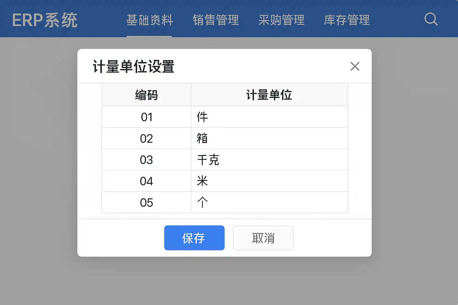 | 3 | 新增/编辑“计量单位” | 输入如:个、箱、千克等 |