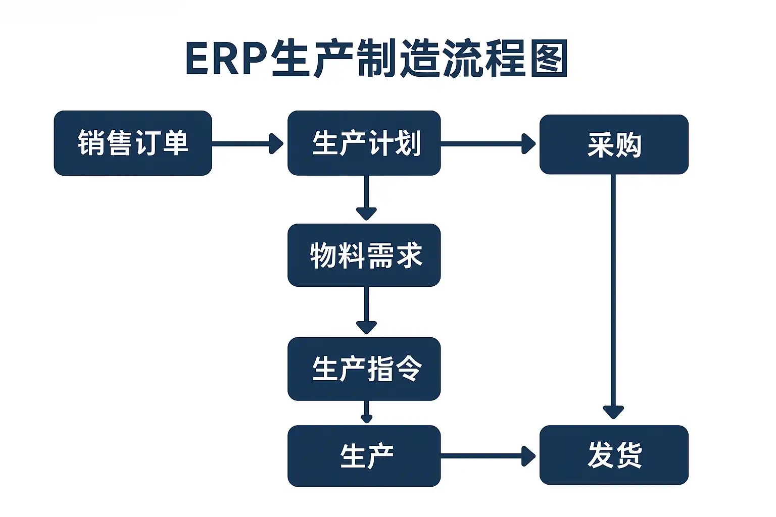 ERP(Enterprise Resource Planning 企业资源计划)生产制造流程图,是以图形化方式将制造型企业的主要业务流——从采购原料到产品出库——各个关键节点及其关联关系直观呈现出来的工具。它不仅是企业梳理内部业务脉络的重要手段,也是规范操作流程与信息流转的基础。例如下方常见流程结构: