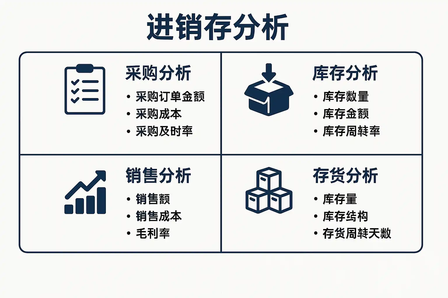 进销存管理涵盖采购(进)、销售(销)、库存(存)三个环节。对这些环节进行系统性分析,是提升企业运作效率和盈利能力的重要手段。以下为进销存分析的四大核心板块: