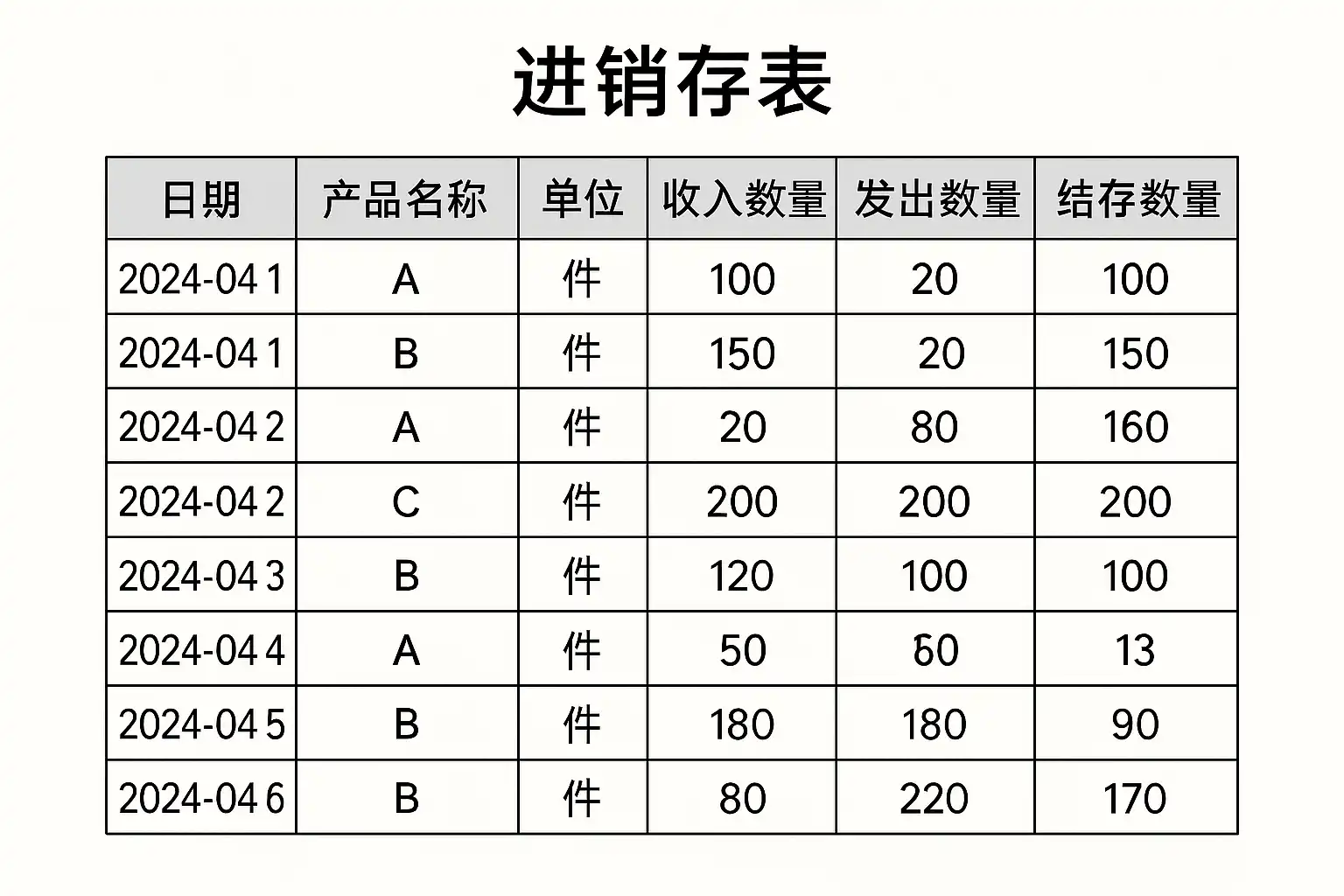 - 库存汇总表 字段示例:商品编号 | 商品名称 | 期初库存 | 本期入库 | 本期出库 | 当前结余