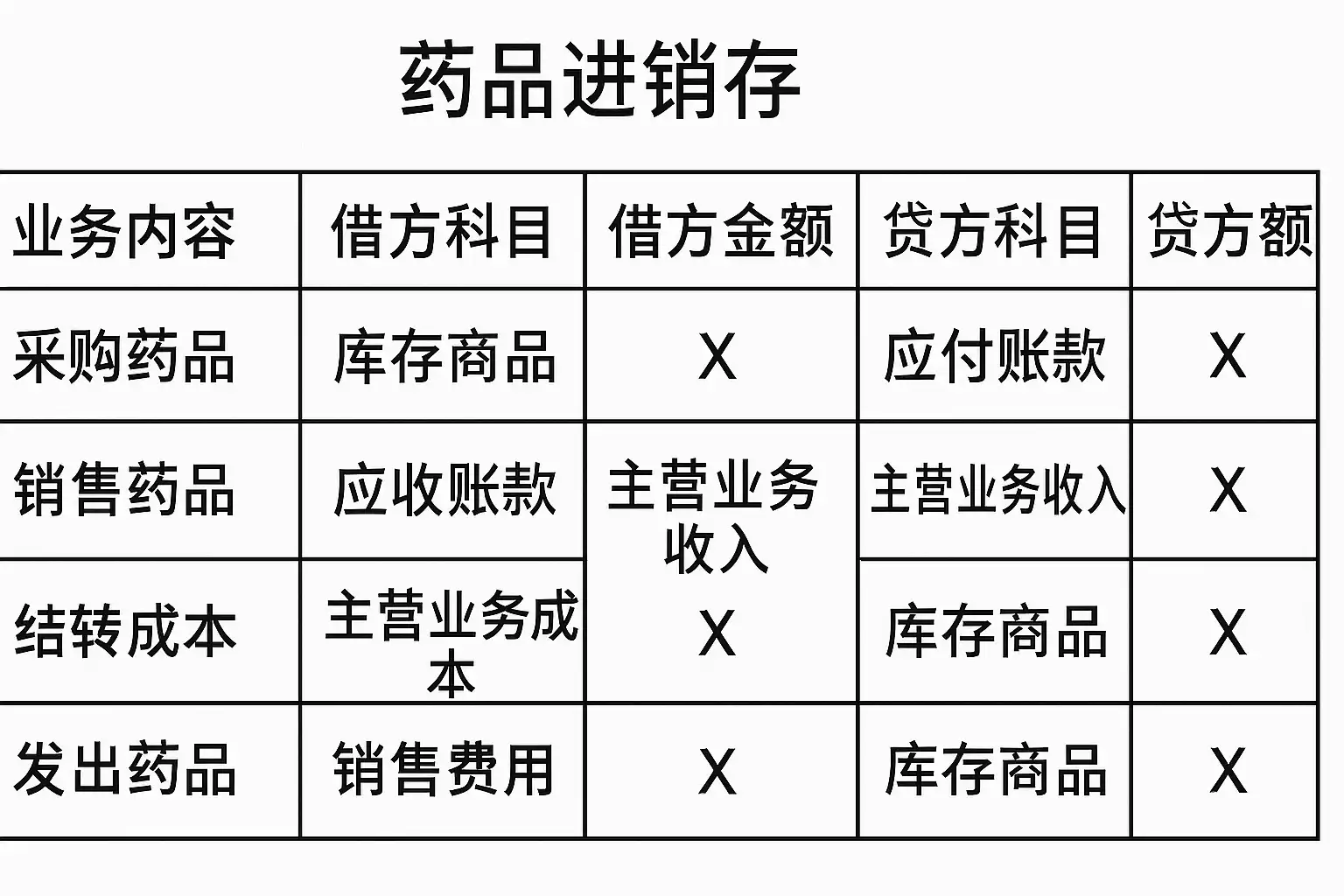 | 销售出库 | 药品销售并发货 | 借:应收账款/银行存款 |