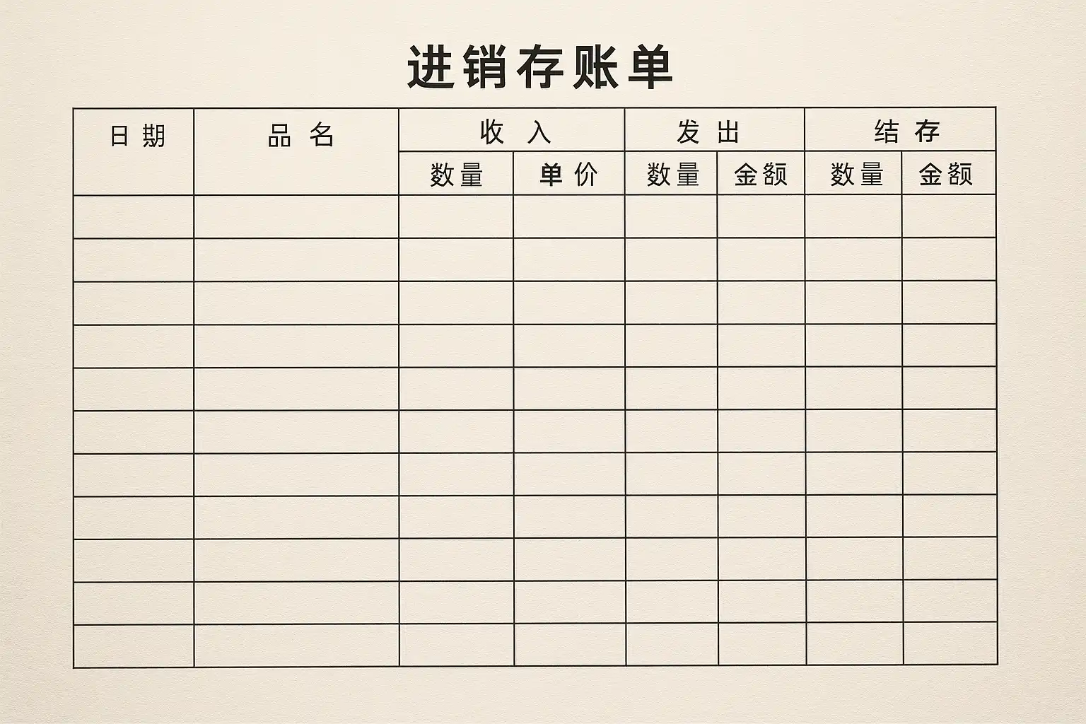 采用表格格式书写库房进销存账单能显著增强信息密度及条理性。推荐包含以下列项: