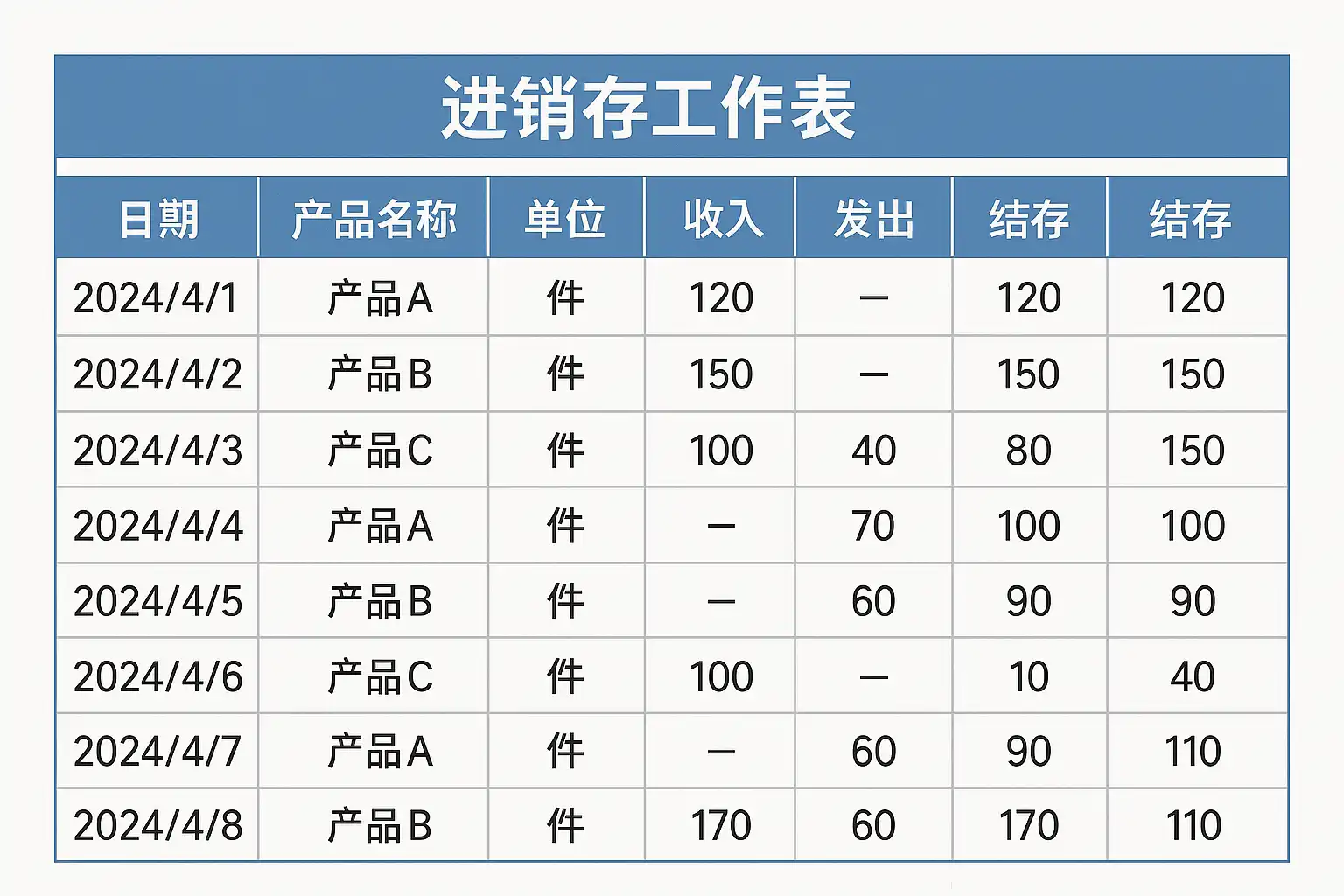 - 明确表格结构:通常包含商品编码、名称、规格、单位、进货数量与金额、销售数量与金额、库存数量与金额等字段。
