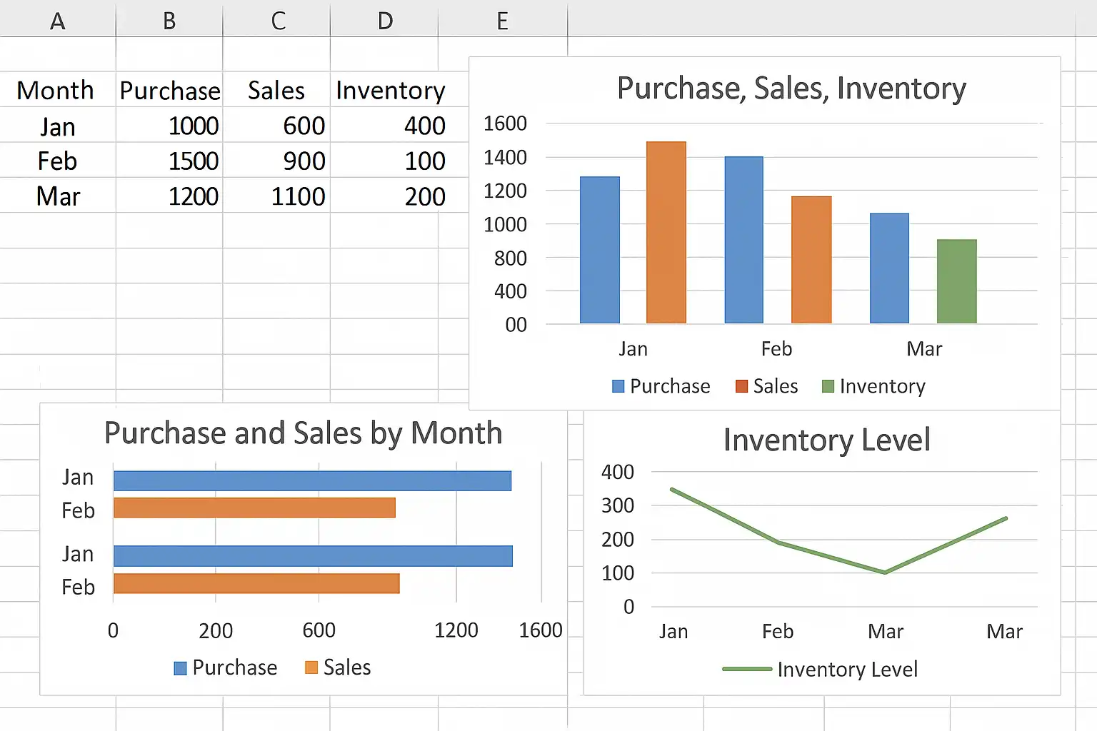 - 选择合适的图表类型:通常使用柱状图展示采购与销售对比,折线图显示库存变化趋势。