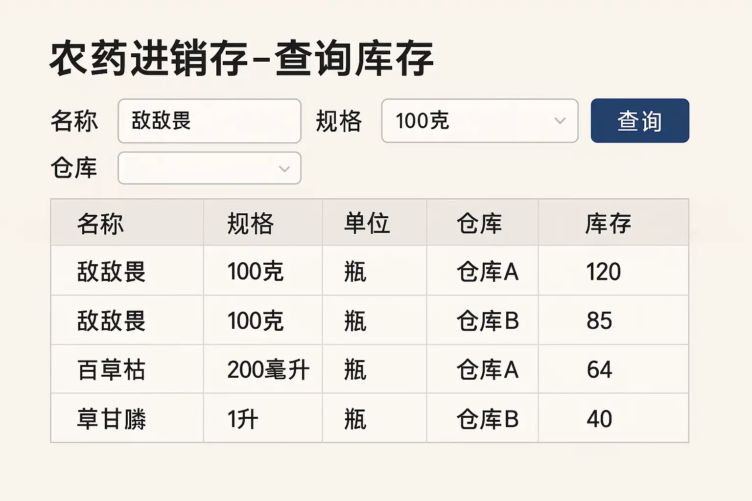 - 使用系统内置的库存查询模块,输入具体农药名称或编号。