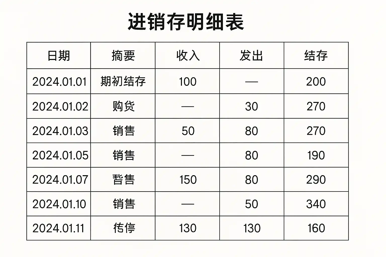 | 结存数量 | 当前剩余库存量 | 按公式计算得出 |