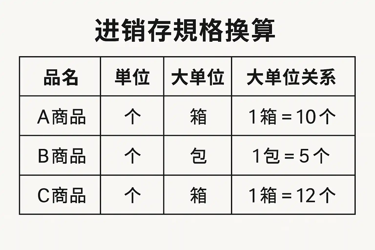 - 明确各规格之间的换算关系,如1箱=12件;