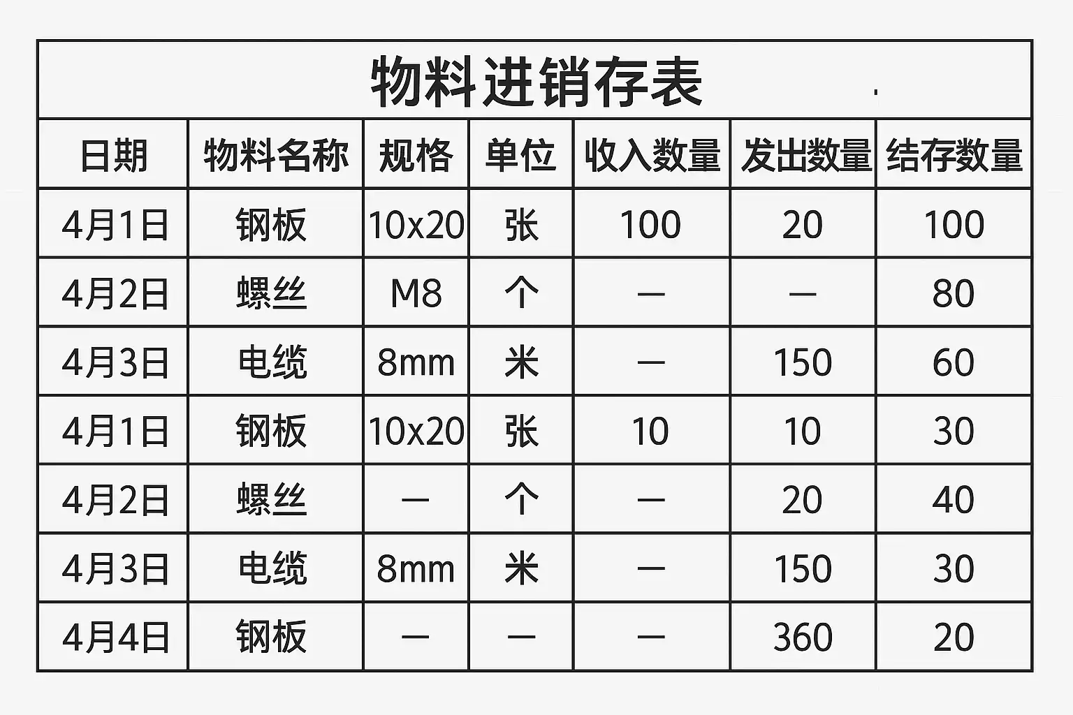通过这种结构化布局,可以清晰反映物料从采购到销售全过程,提升库存管理效率。例如,某制造企业通过记录每日入库和出库量,实现了月度库存准确率达到98%以上。