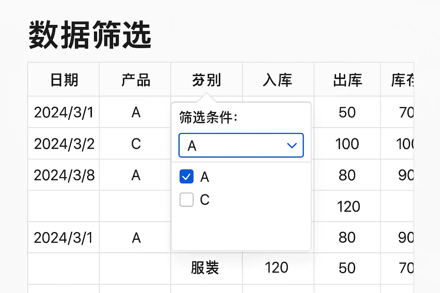 | 多维度过滤 | 同时基于多个字段进行条件设置,实现精确筛选 | 筛选2024年第一季度且类别为办公用品的库存 |