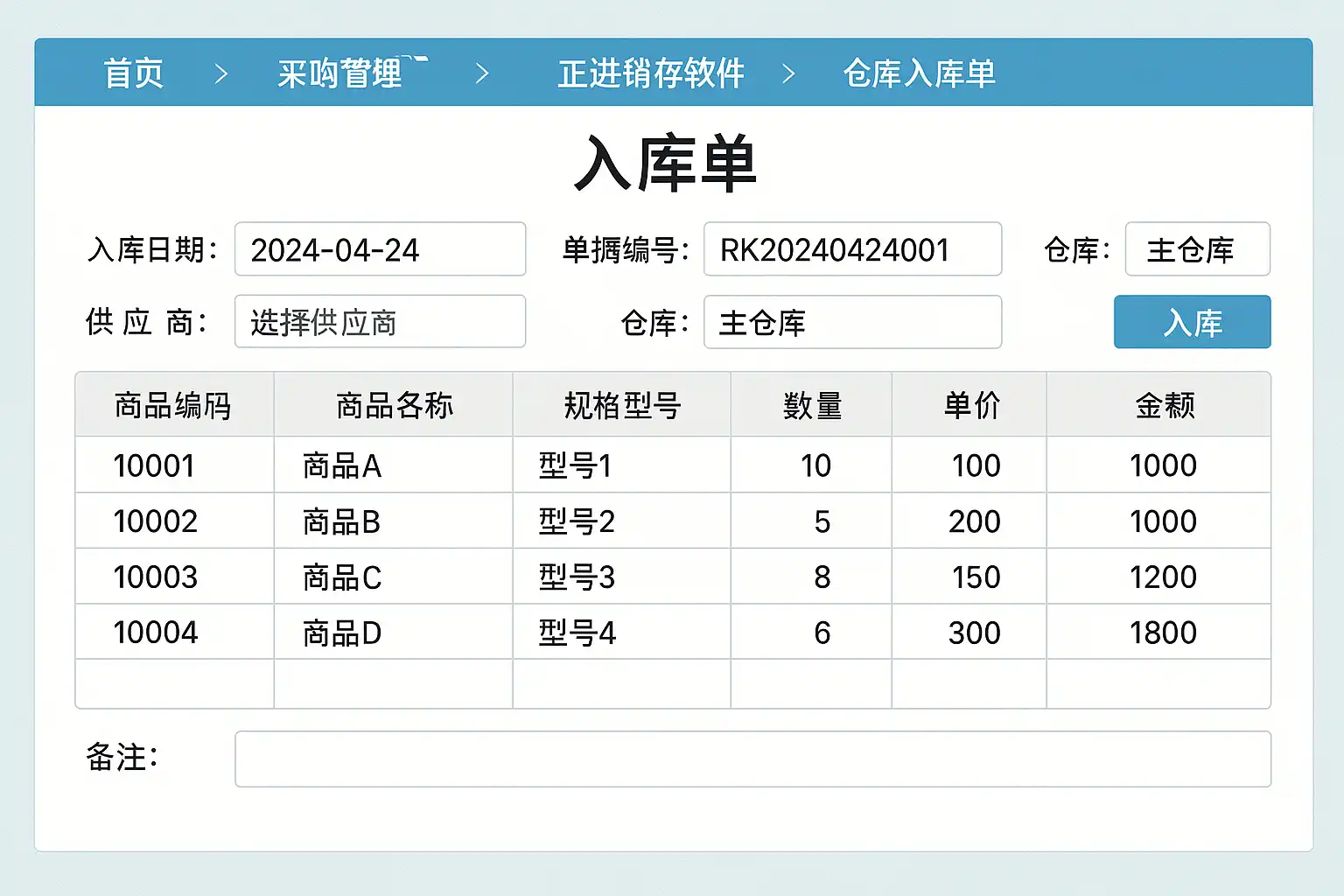 正进销存软件的入库流程主要包括以下几个步骤: