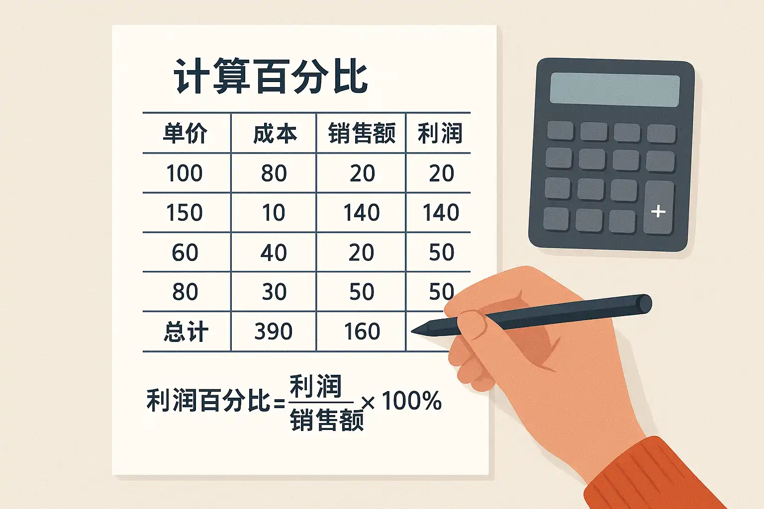 例如:如果销售收入为100,000元,进货成本为70,000元,则利润比例 = (100,000 - 70,000) / 100,000 × 100% = 30%。