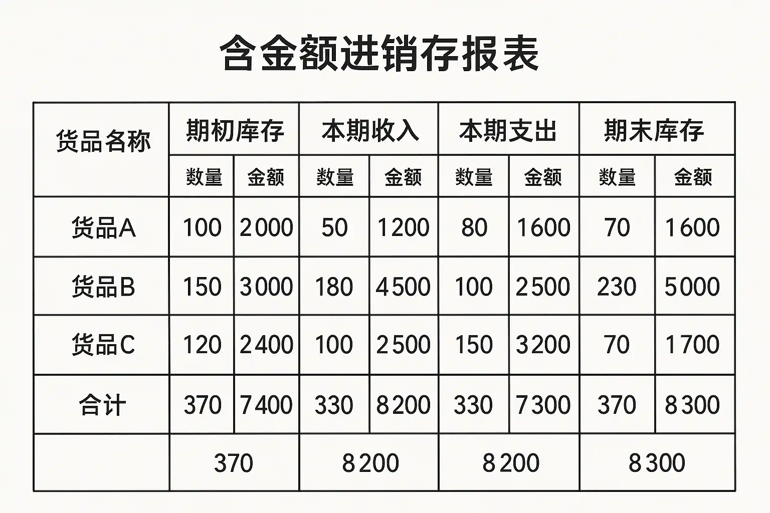 含金额进销存报表,是指在传统数量型进销存基础上,将“金额”维度纳入管理和统计范围的详尽报表。它不仅展示库存商品的数量流转,还反映了相应货值变化,是企业财务管理和内部控制的重要依据。