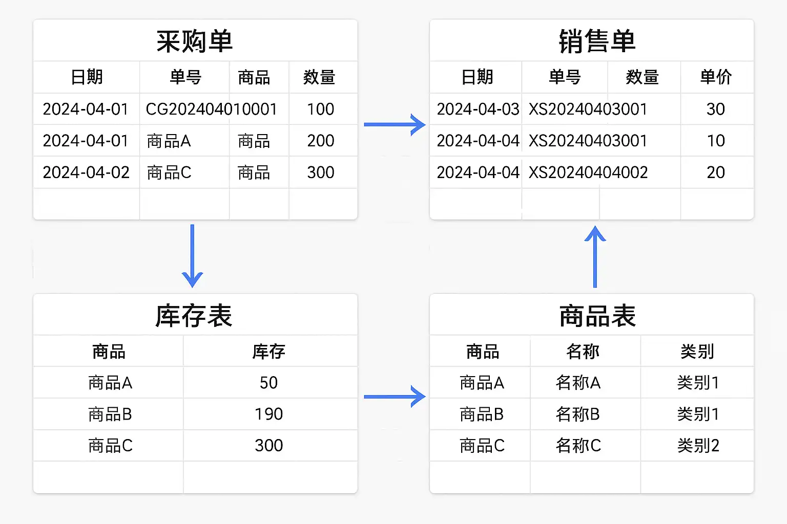 常见的进销存多表联动技术方案包括: