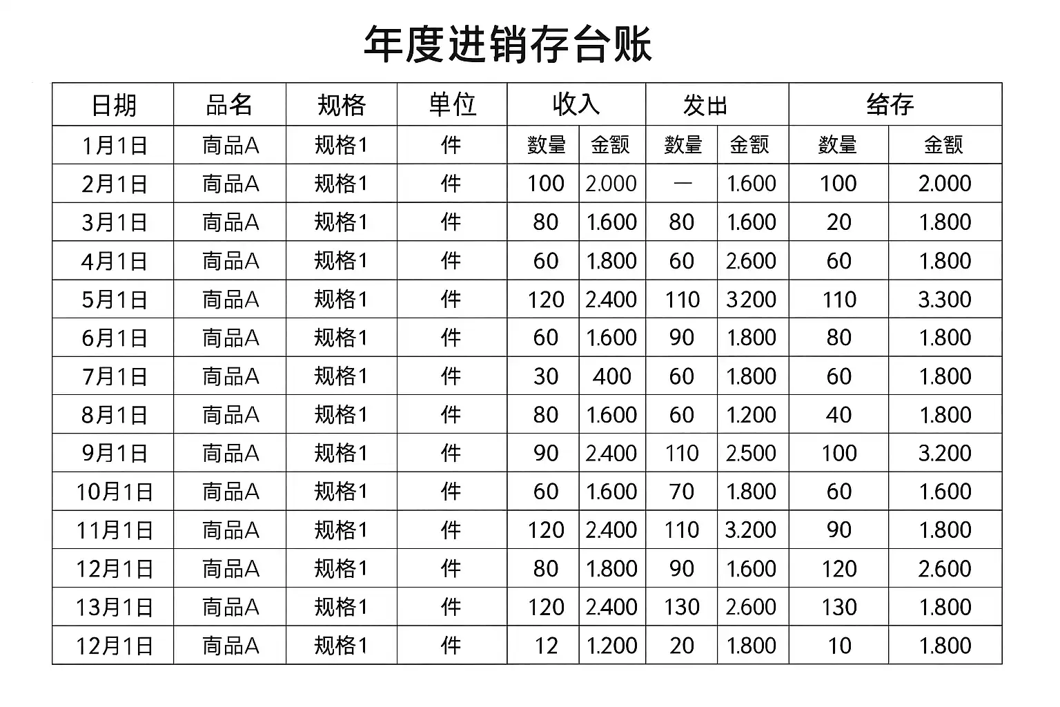 - 期初库存数量及金额:作为年度起点数据。
