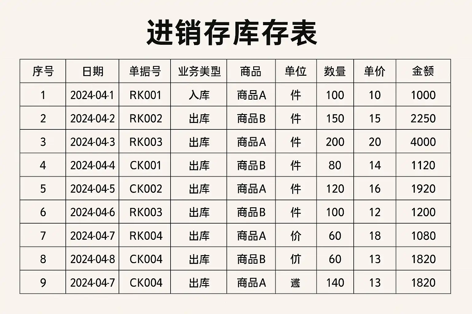 | 日期 | 单据号 | 商品编码|供应商|数量|备注 | |------------|------------|- |- |- | 2024-05-01|IN24050101 |A001 |XX纸业 |10 |首批采购 |