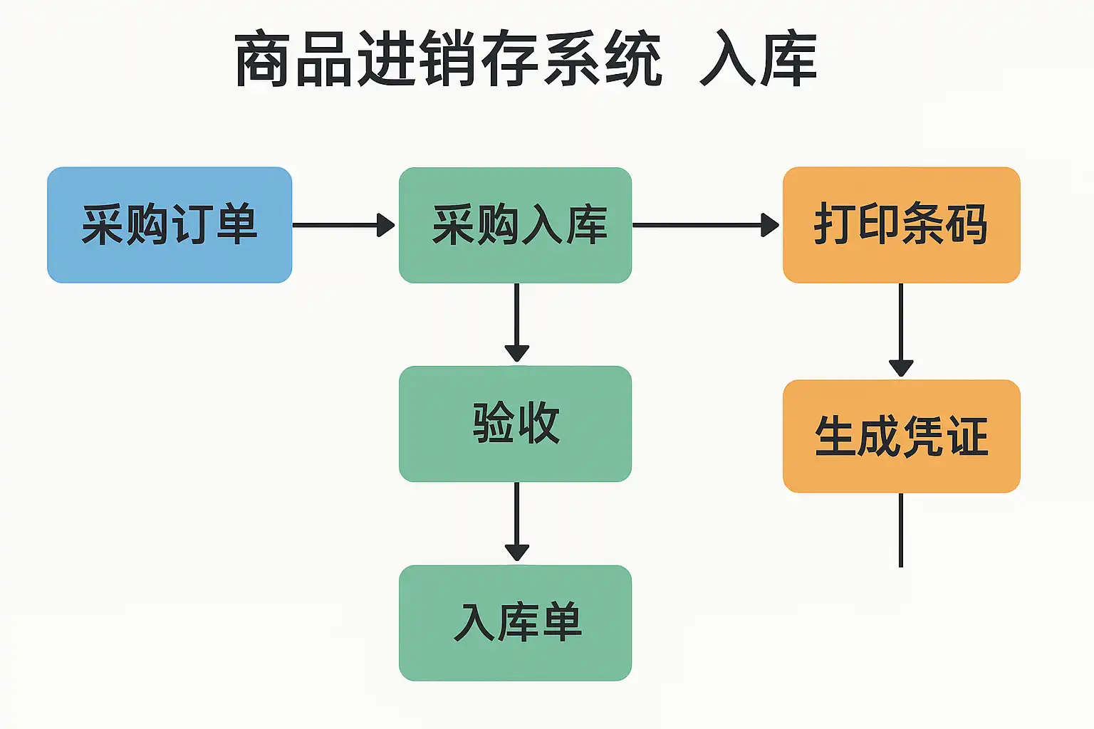 - 系统录入:将验收合格的商品数据输入系统,完成库存增加。