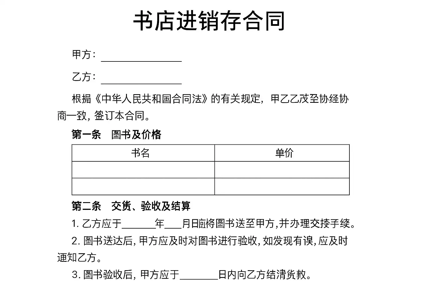 该模板结构清晰,各项内容详尽,可满足大多数中小型书店采购业务需求。如遇特定销售模式,也可自行增删调整相关条款。