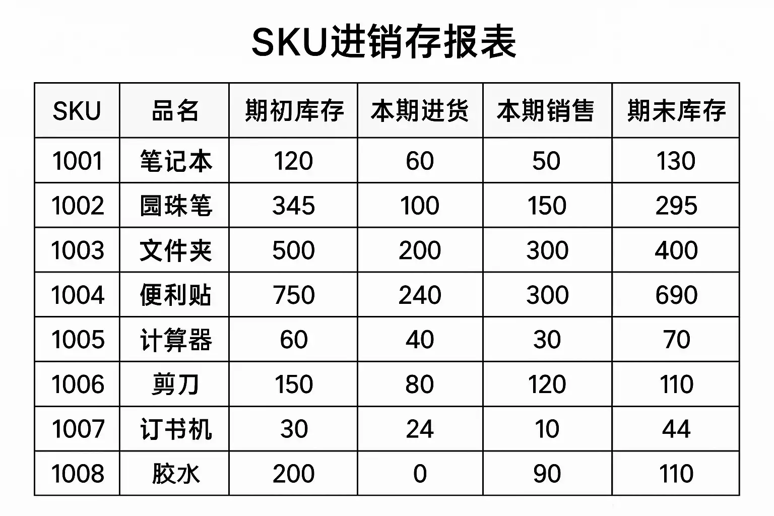 随着企业产品线扩展,SKU(库存保有单位)种类急剧增加。这给传统进销存报表制作带来了如下主要挑战: