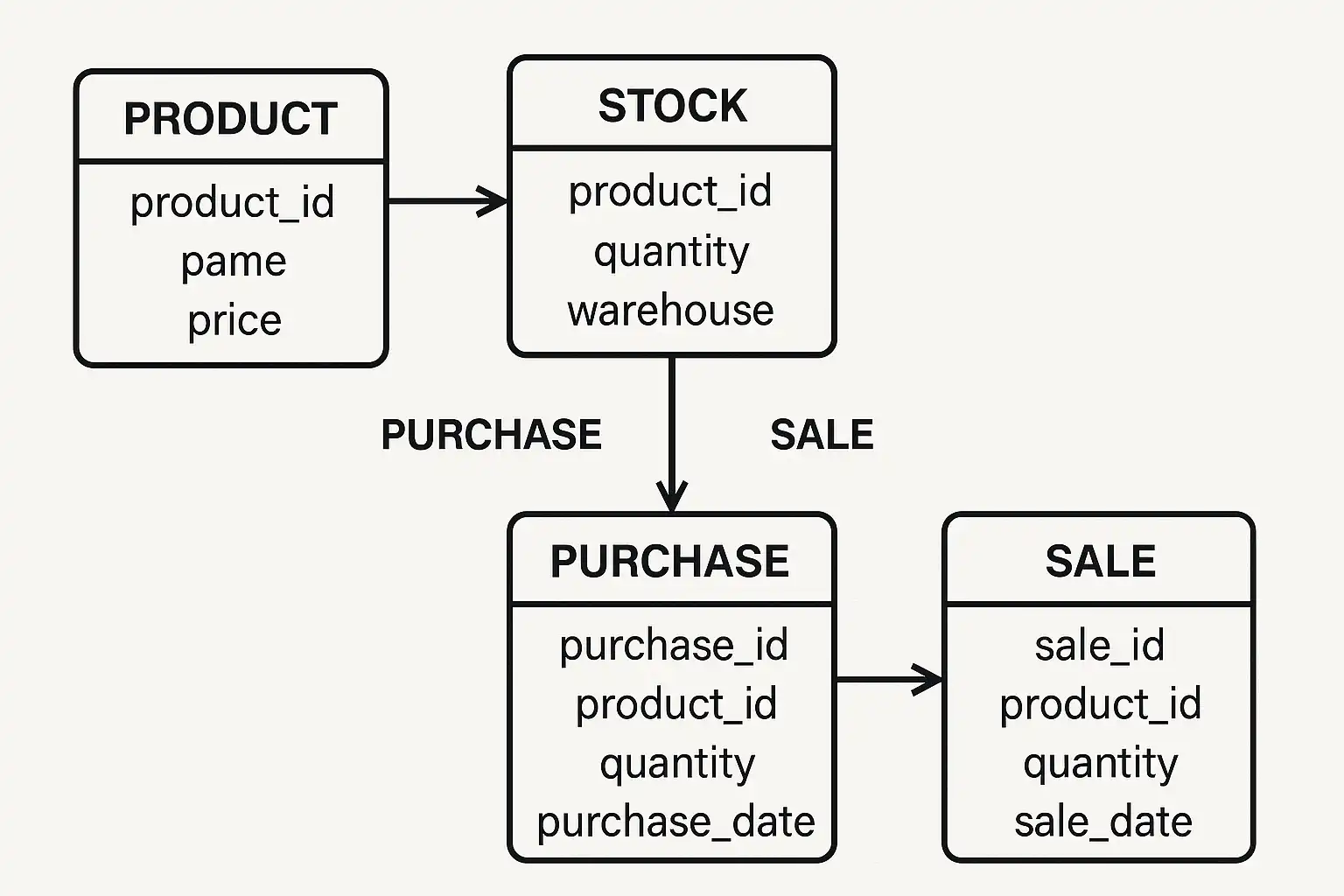 - 单据主从:每笔采购/销售生成主单,明细行记录具体商品及数量;