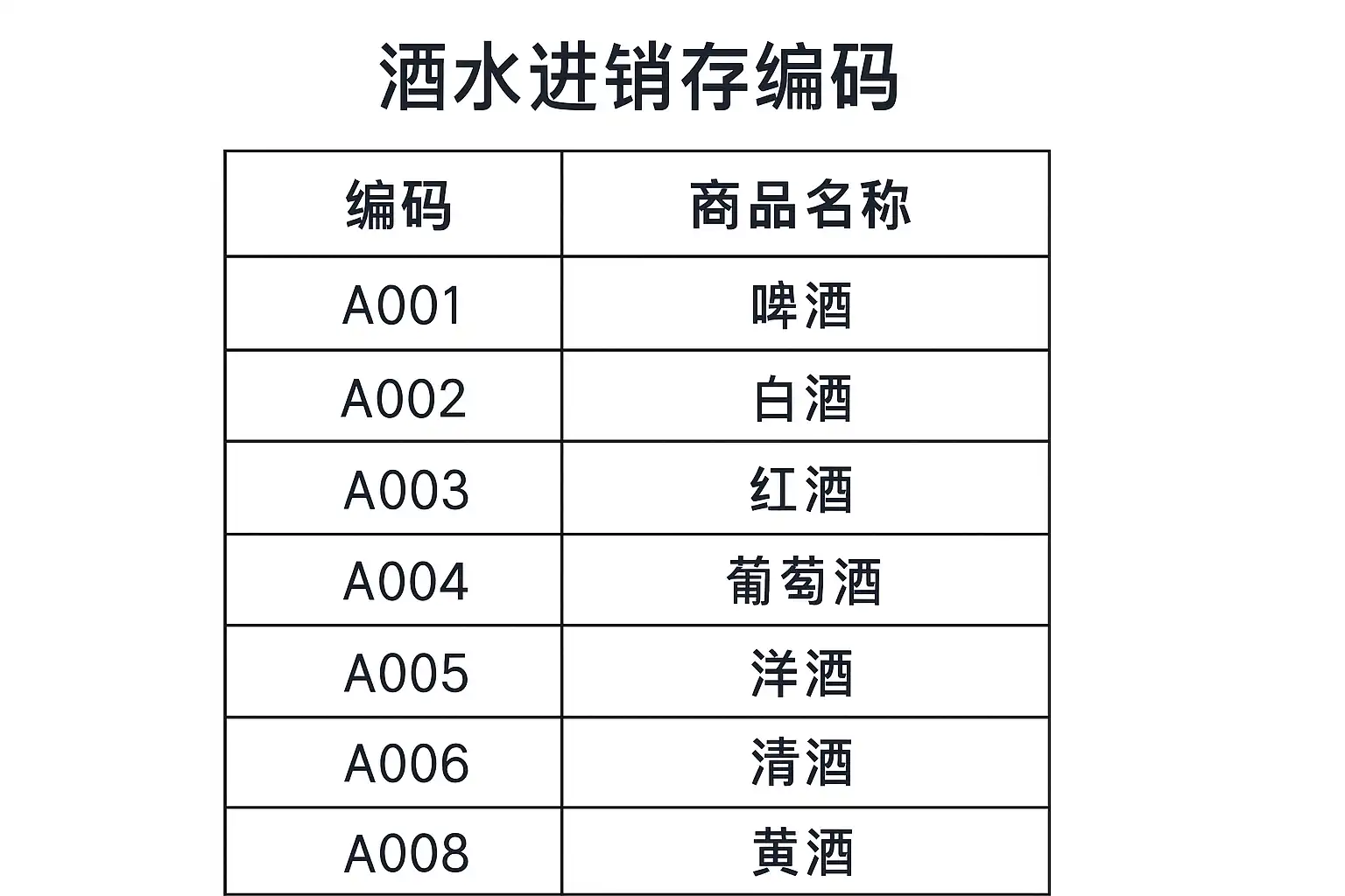 - 易识别性:通过编码即可快速判断酒水类别、品牌或规格。 案例说明:例如“JW-BJ-001”代表“酒类-北京-第一款产品”,方便仓库管理和数据统计。
