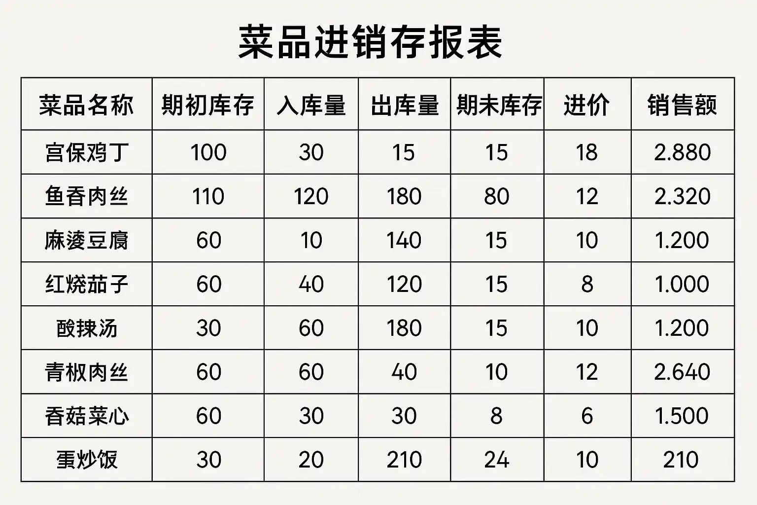 - 表格示例:结构化展示多维度数据,比如日期、菜名、单位成本、销量及库存余额等,可直观比较趋势与异常情况。