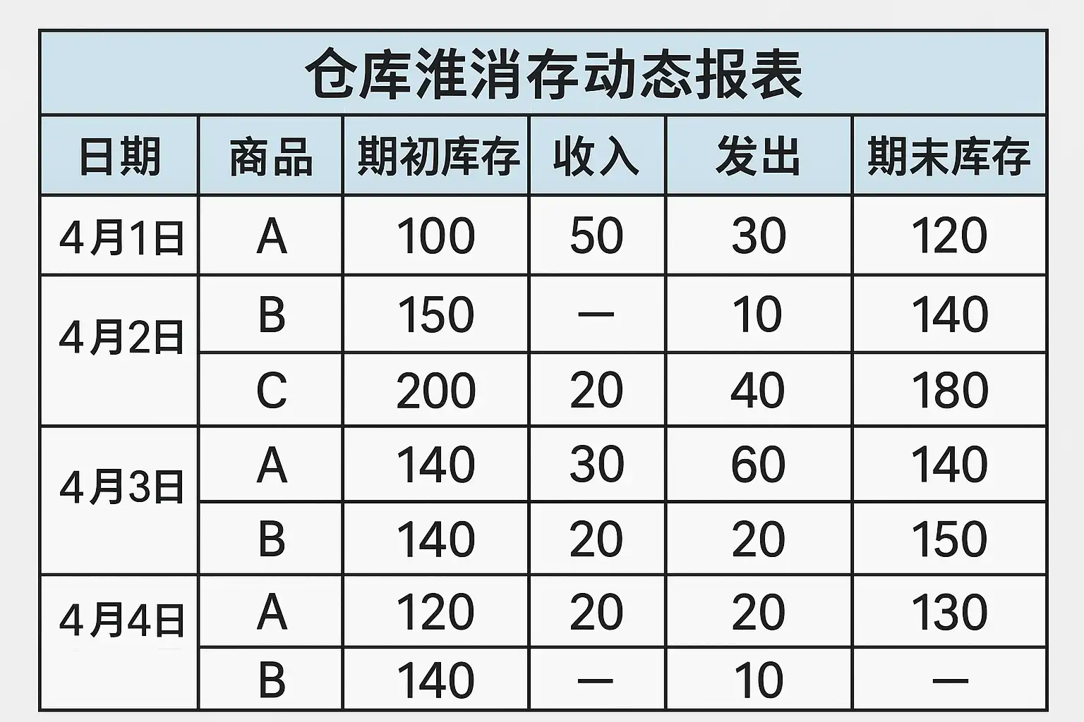 | 期末库存 | 本周期实际剩余 | = 期初+入库-出库 |