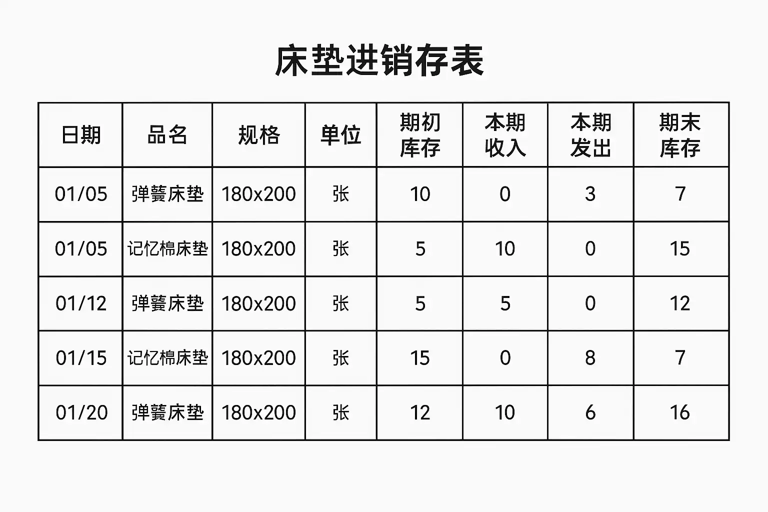 制作床垫进销存表时,应围绕“采购—入库—销售—出库—盘点”五大环节进行梳理:
