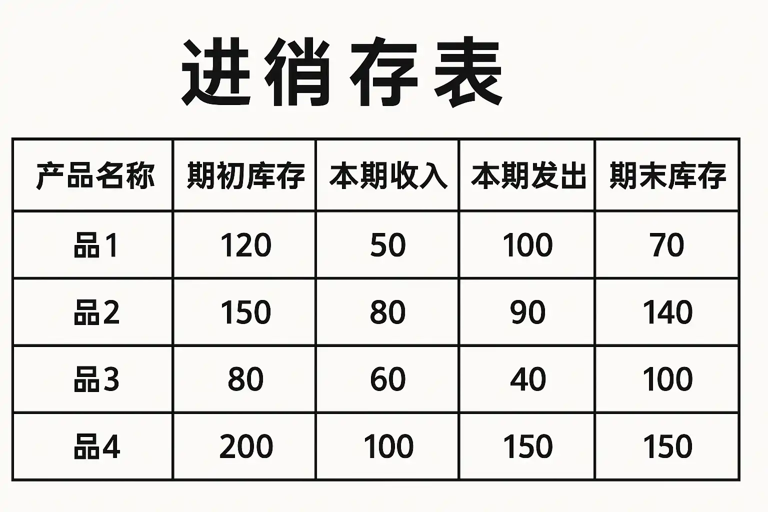 示例: 假设某商品“圆珠笔”,1月初有100支,本月购入50支,卖出80支,则当前库存=100+50-80=70支。