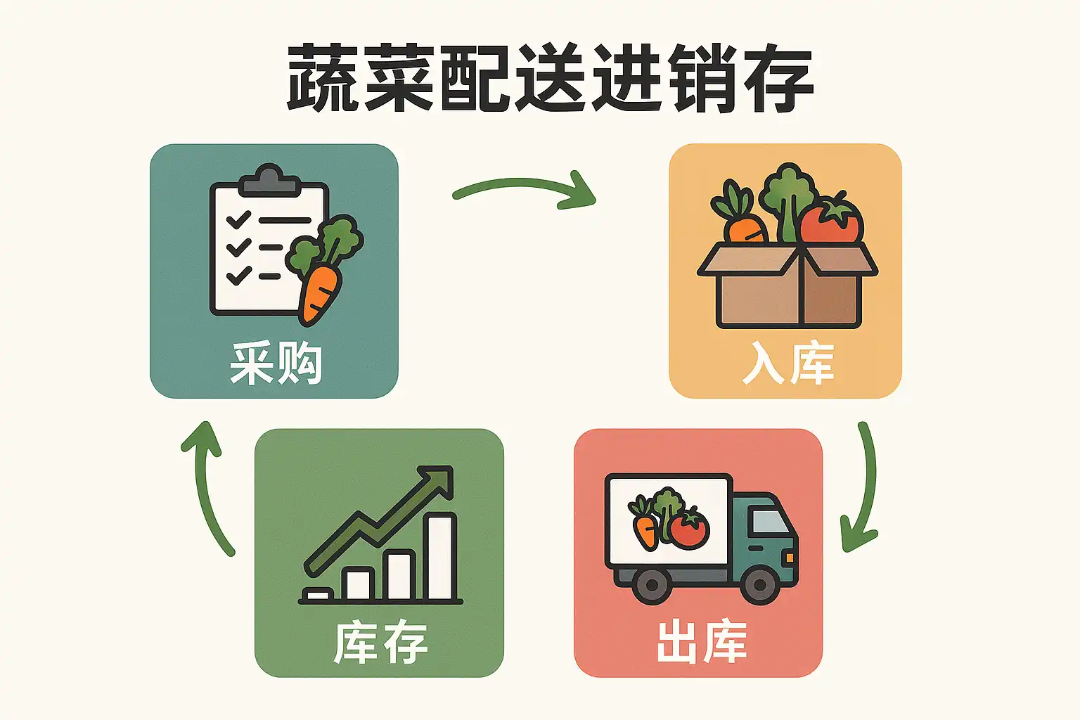蔬菜配送企业在日常运营中,需要面对采购、生鲜库存管理与订单分拣配送等多重任务。其进销存管理的主要目标包括: