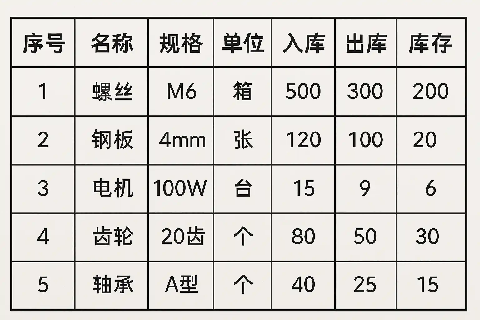 | 动态库存 | 实时反映当前实际库存量 | 使用公式自动计算每笔入出库后剩余量,实现实时更新 |