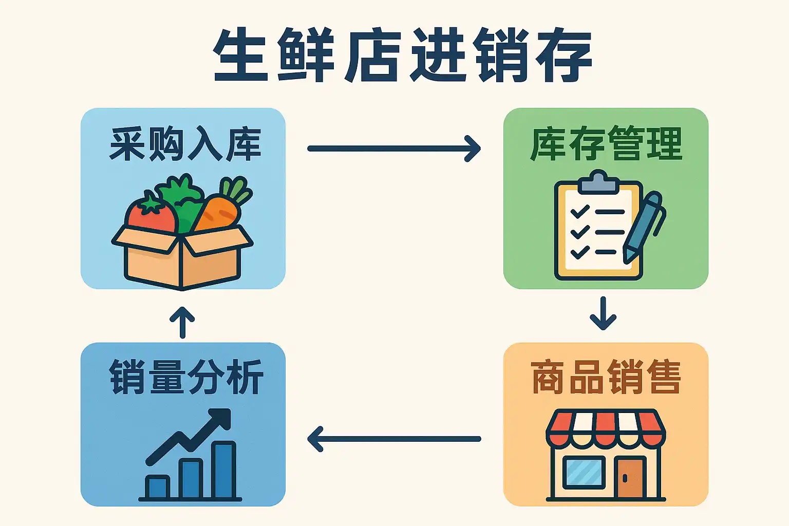 案例:某生鲜店通过引入智能进销存系统,实现库存周转率提升30%,损耗率降低20%。