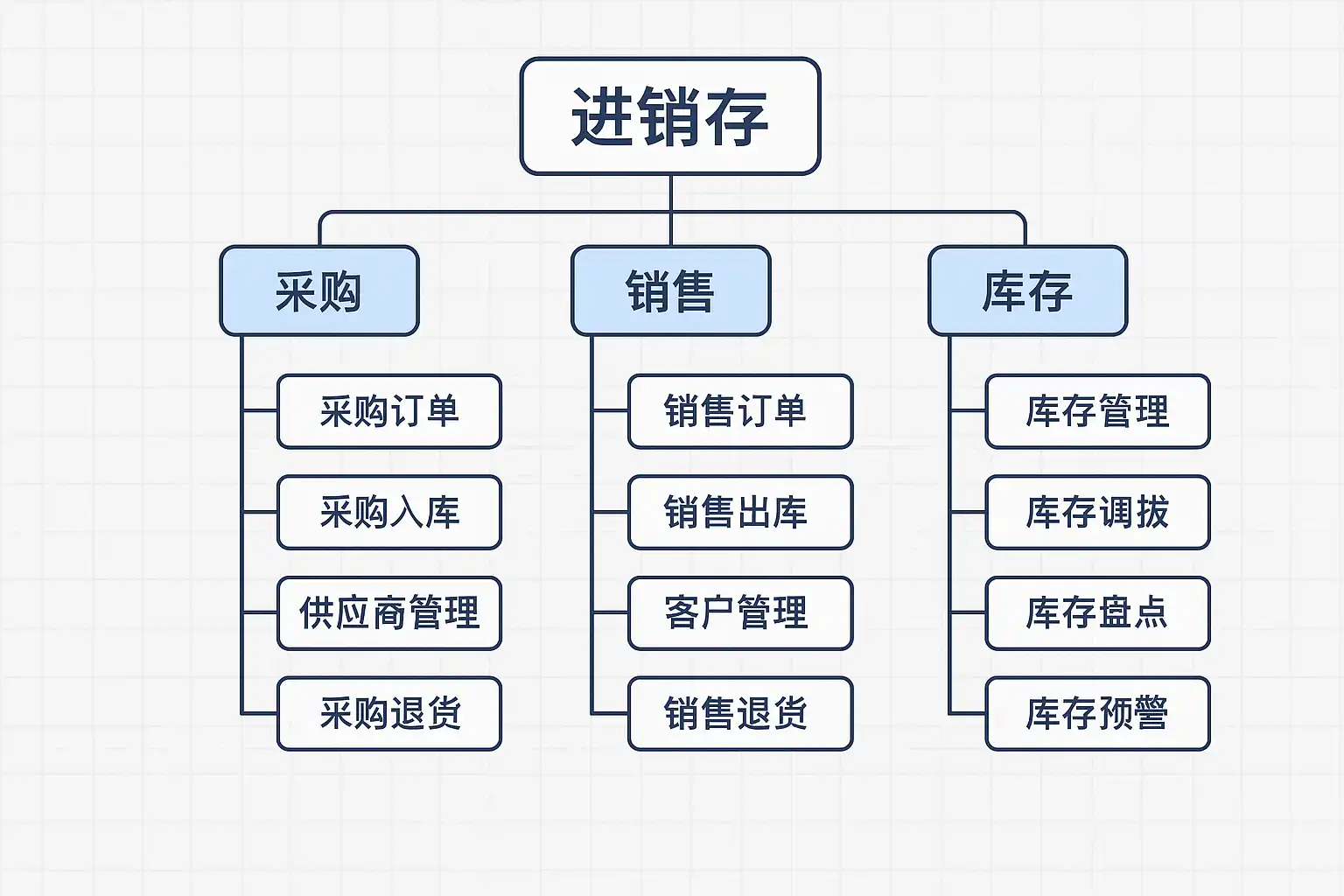 完整的进销存系统,必须覆盖“采购-入库-库存-销售-出库”五大环节,并处理各环节之间的数据流转。具体模块分解如下: