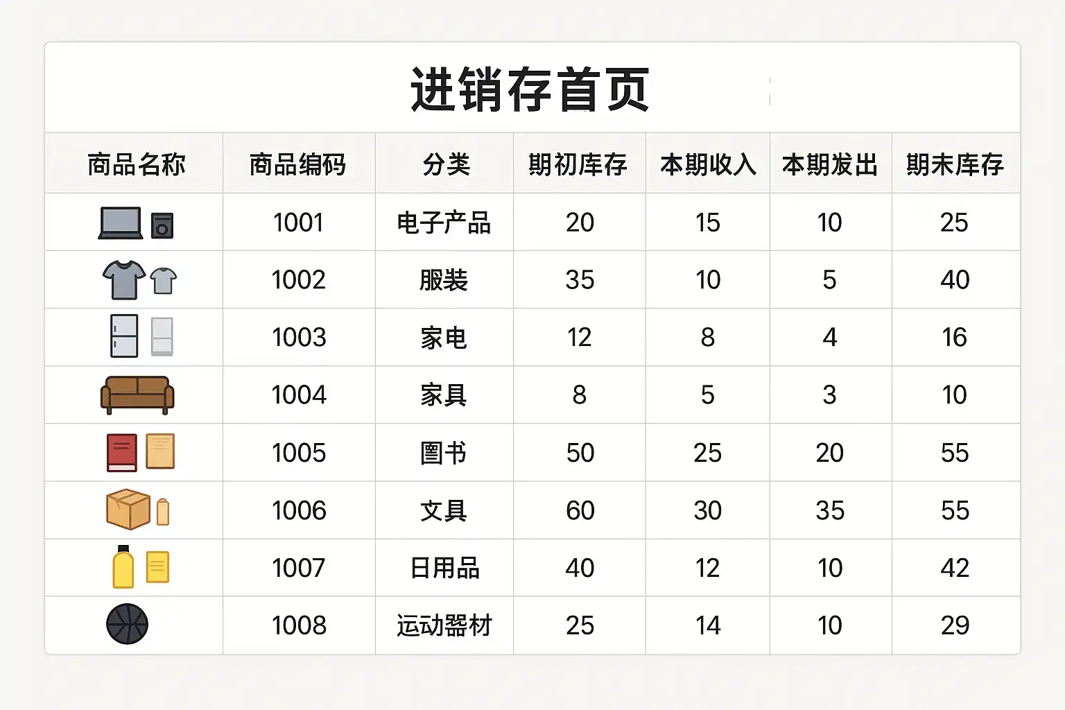 制作进销存首页表格前,需清楚了解企业实际业务流程以及所需监控的关键指标。一般来说,典型的进销存首页应包含如下模块:
