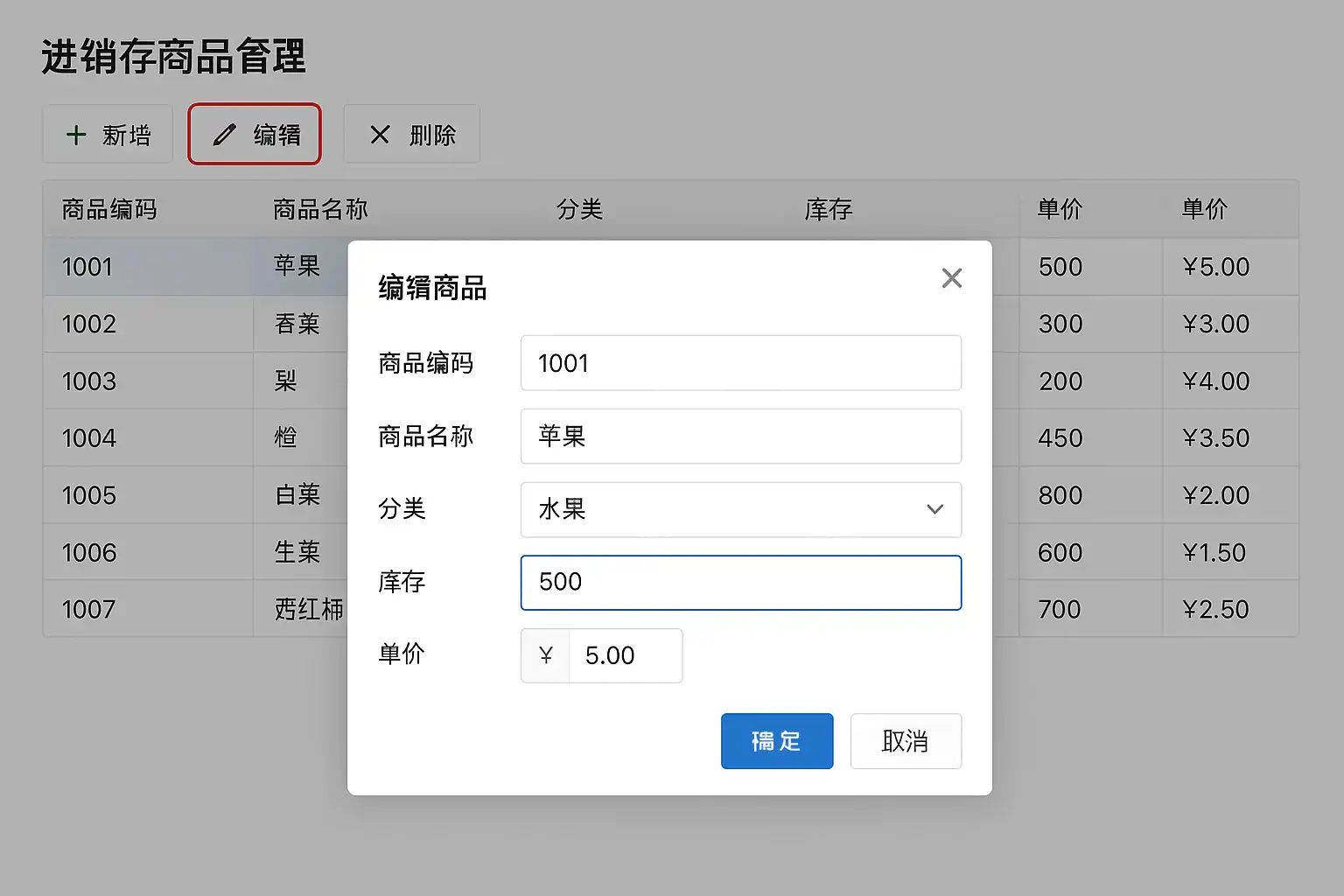 - 点击“编辑”,修改名称、规格、价格等字段。