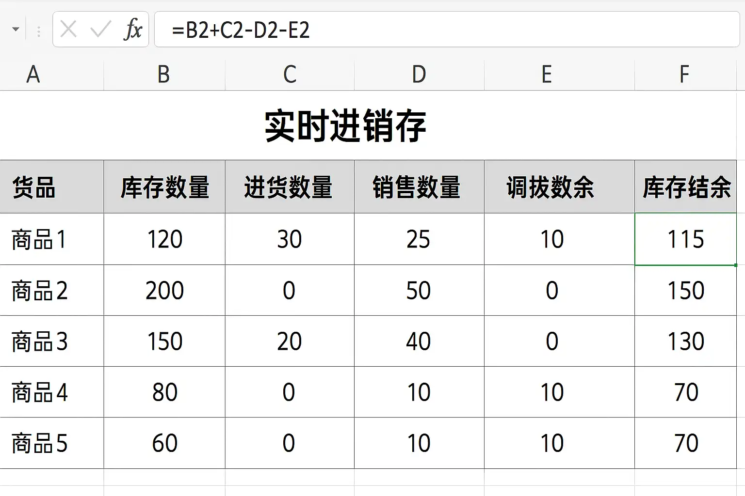 - 通过SUMIFS函数动态计算每个商品的入库量和出库量。