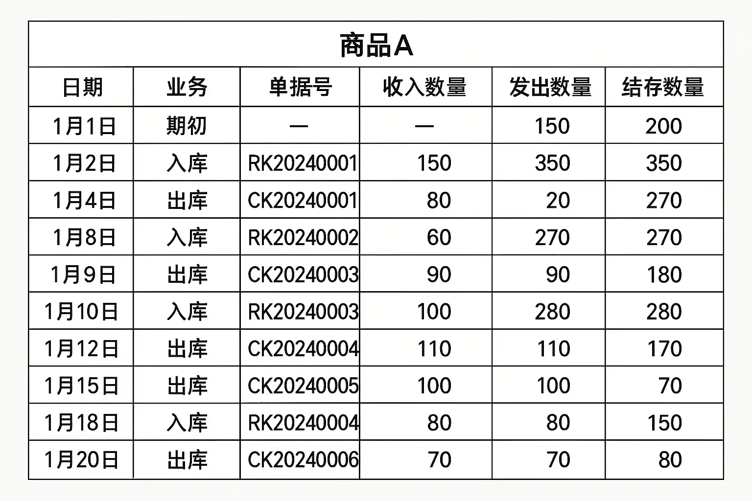 | 2024/6/01 | RK20240601A1 | ”100001” “ | 冰箱” “ | 10 “ | 2000 “ | 20000 “ | 采购入库 |