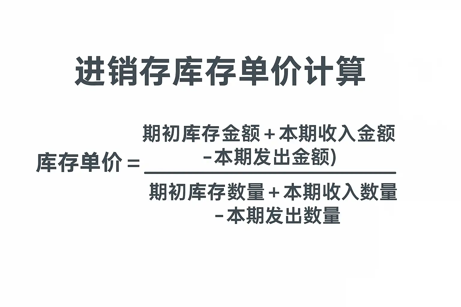 - 公式:新单价 = (原库存数量×原单价 + 新入库数量×新单价) /(原库存数量 + 新入库数量)