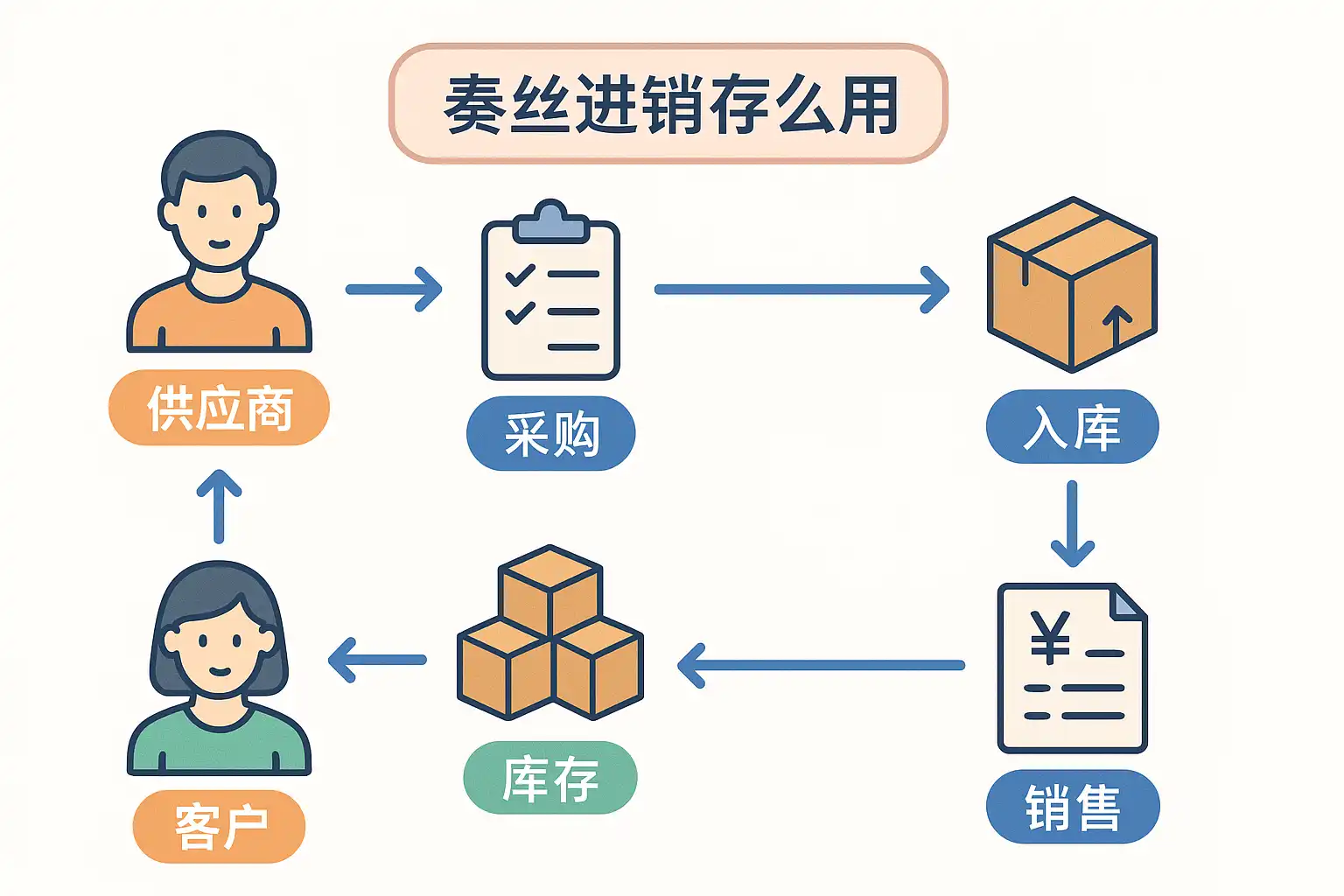 为了便于理解,以下以典型业务流为例,用简明图示及步骤列表梳理完整进销存过程: