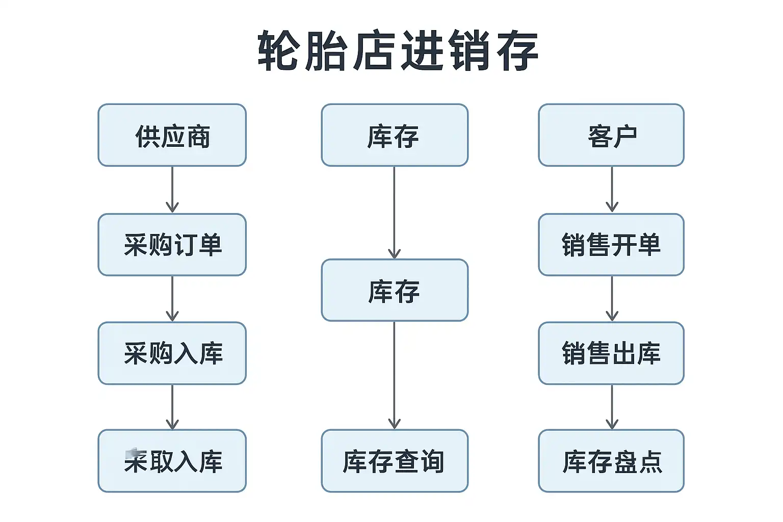 graph TD;A[制定采购计划] --> B[下单给供应商];B --> C[到货验收];C --> D[扫码入库];D --> E[系统同步更新库存];E --> F[日常销售出库];E --> G[定期盘点校准]通过上述闭环流程,可确保每一条轮胎都“有迹可循”,防止因信息滞后导致断码或积压。
