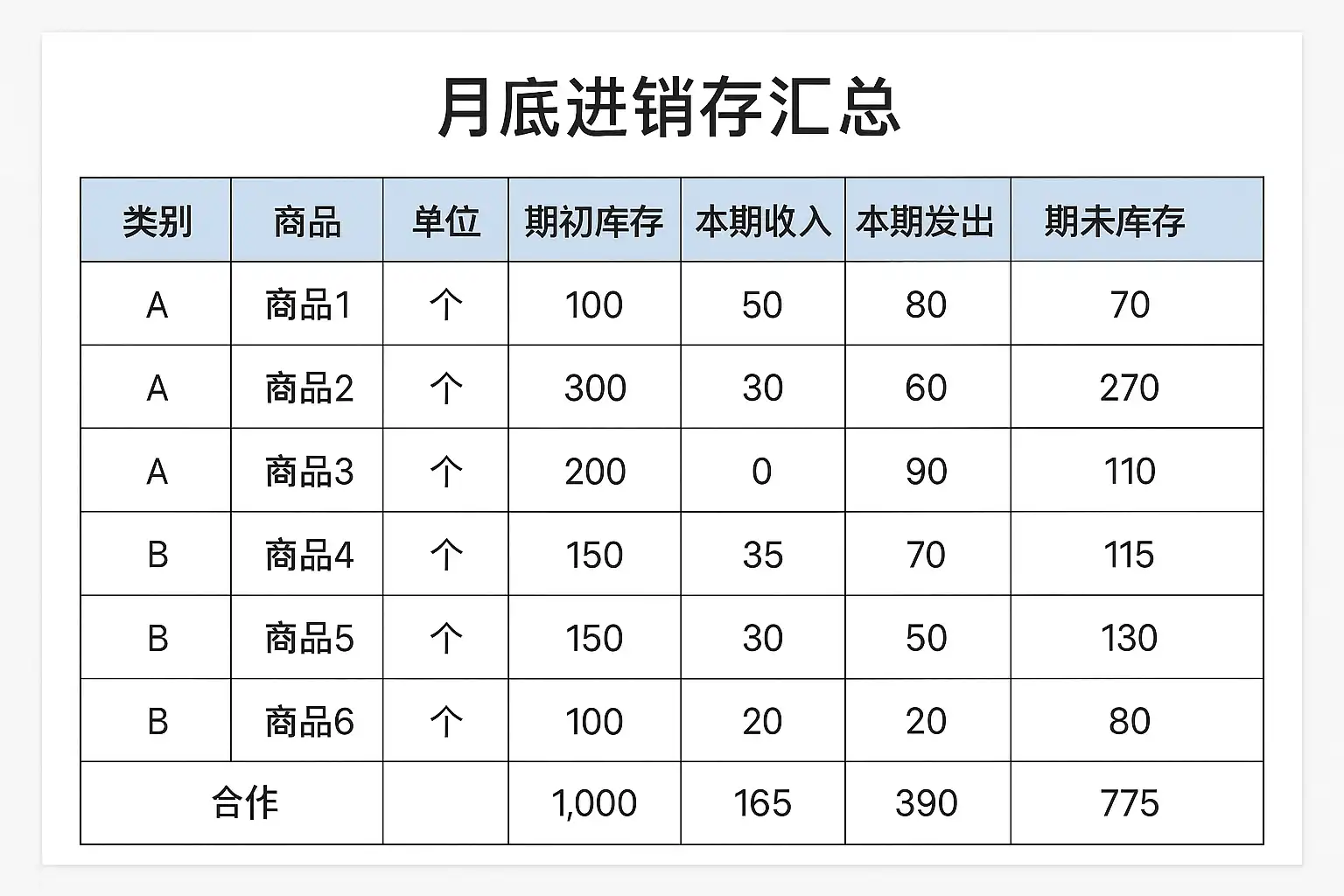 - 利用表格展示关键数据,如商品名称、期初库存、本期入库、本期出库、期末库存等指标,使信息一目了然。