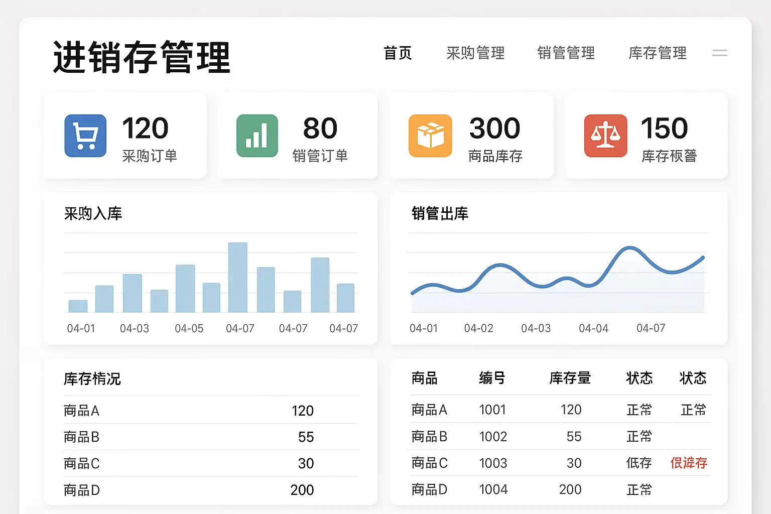 一个好的进销存首页不仅展示数据,还需方便用户日常业务操作。例如: