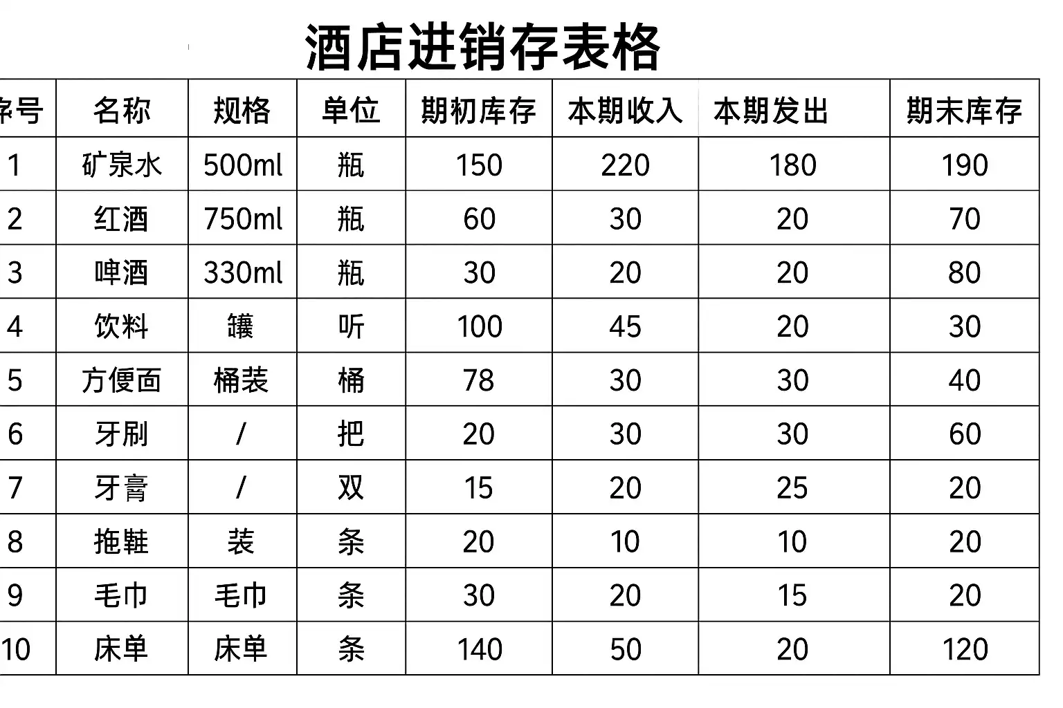 #### 客房部进销存明细商品编号|商品名称|单位|期初库存|入库数量|出库数量|库存结余|H001|沐浴露|瓶|200|100|120|180|H002|毛巾|条|1000|300|350|950|这种做法能实现责任到人,提高监管效率。