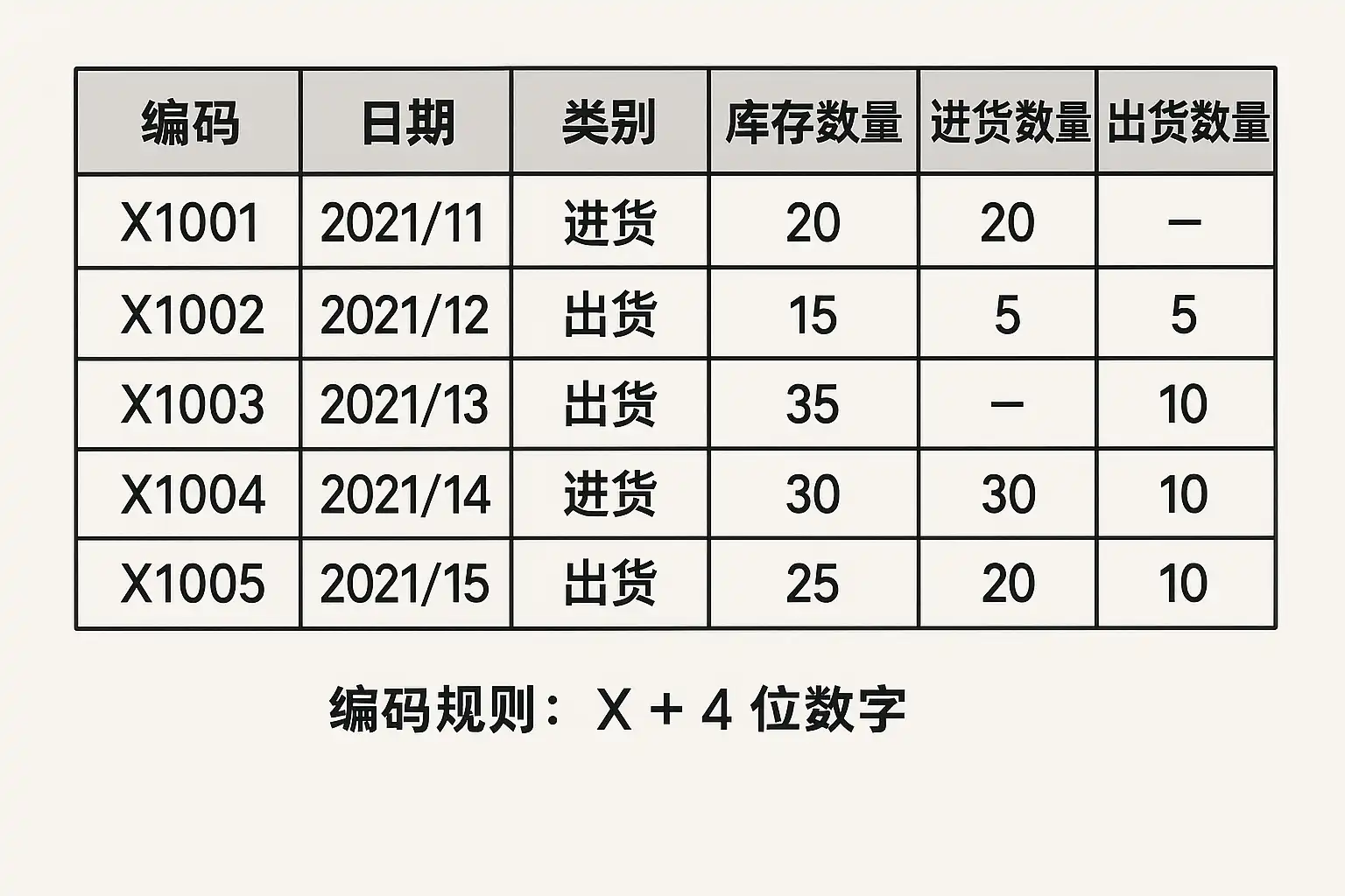 - 不同类别设定不同前缀(如“CK”为仓库,“XS”为销售)