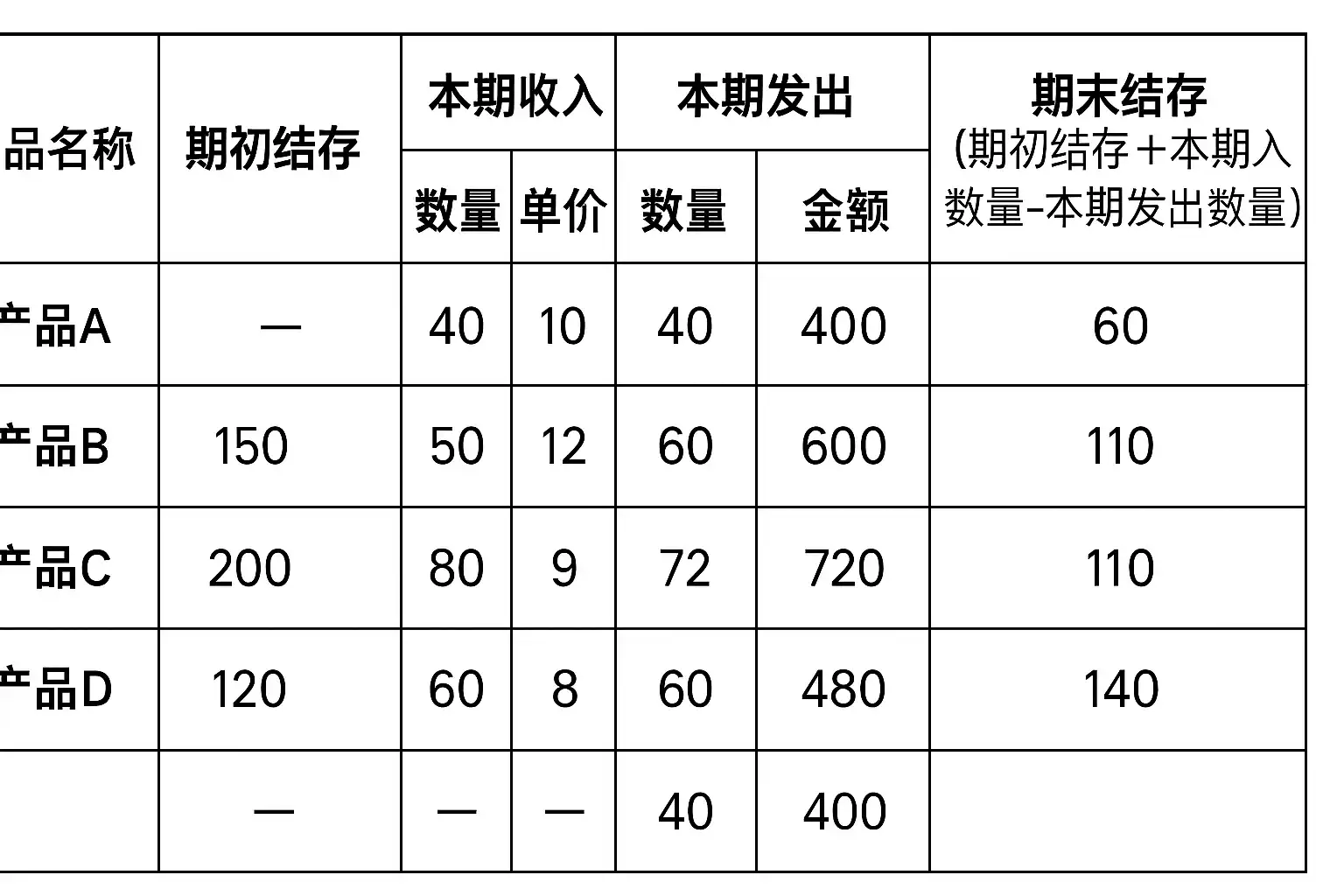 期末结存 = 期初库存 + 本期采购(或生产) - 本期销售 - 损耗/报废各要素解释: