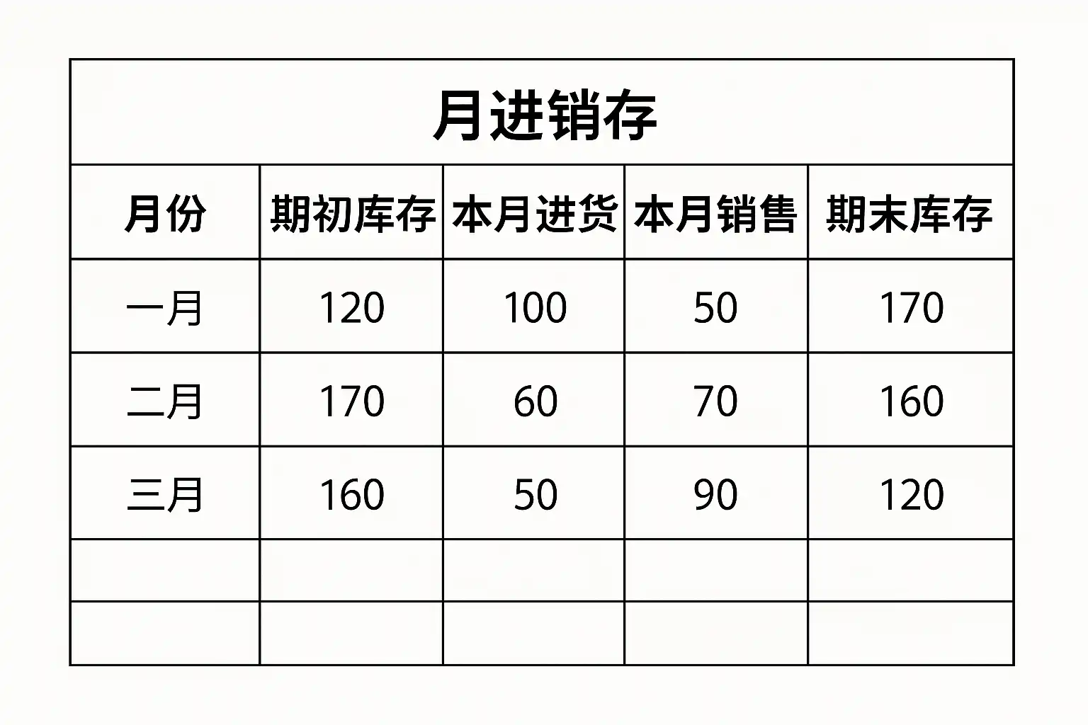 | 产品编号|期初库存|本月入|本月出|期末库存| |-|-|-|-|-| |A001|100|50|30|=100+50–30=120|