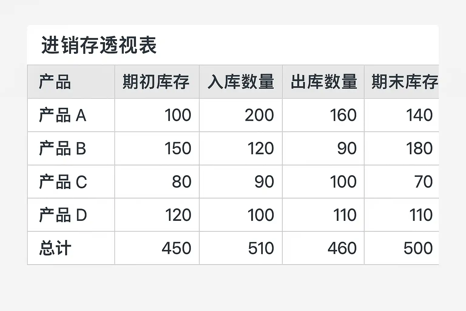 进销存透视表是一种利用Excel或专业软件,将采购、销售和库存数据动态汇总、分析的工具。通过透视表,可以快速查看各商品的销售趋势、库存水平及采购情况。例如,利用透视表统计某月份A产品销售量和库存变化,有助于精准补货决策。数据显示,使用透视表可提升库存周转率15%以上,从而降低资金占用。